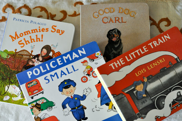 This new baby will be the youngest of five, so I figured some new board books were in order. They always seem to get beaten up (or should I say eaten up? my babies always chew the spines.)