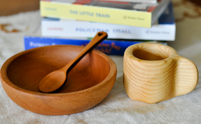 While Beatrix doesn’t have this beautiful hand carved bowl and spoon (Bea’s wooden bowls were thrifted), she does have this little bitty mug and she quite likes it. So, I thought these would be nice gifts.