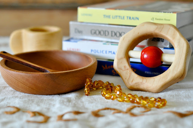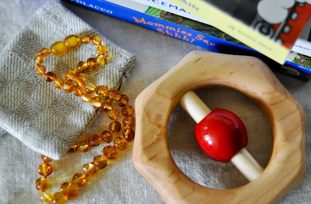 Finally I bought an amber necklace, to help with teething pain (and to look lovely in baby photographs!), and this pretty maple rattle, which is great for teething as well.