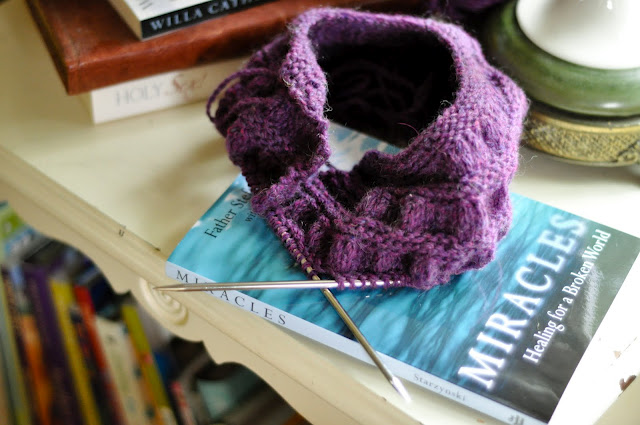 The yoke of this sweater (I modified the pattern, also for Larkspur) seems to be taking me forever, maybe because I’ve been reading Miracles: Healing for a Broken World