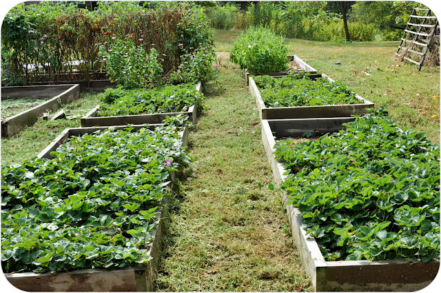 (You can see the view from early June HERE. And HERE is a post from May with garden pics including Trudy as a little puppy and our mama hen and baby chicks in case you missed them! And finally HERE is a post showing the installation of the raised beds. )