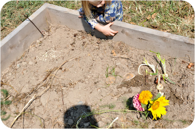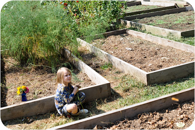 She planted onions from my bag, along with sprouted onions discovered in other places in the garden left over from our spring crop. She also “planted” a bunch of peas in the other corner. I am not sure what they will do, if anything. I think there is also spinach, kale, clover, and collards planted here. And of course even Larkspur’s garden needs a vase of flowers.