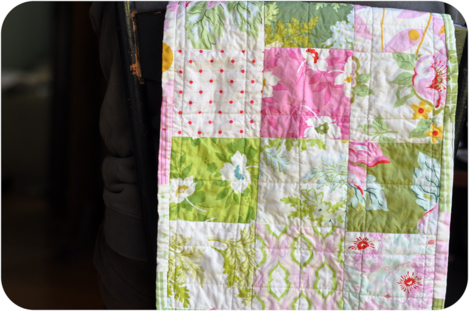 Once Keats finished the quilt top, I assembled the quilt, questioning how anyone gets through hand sewing the binding on a full sized quilt! I am terrible at hand sewing.