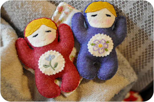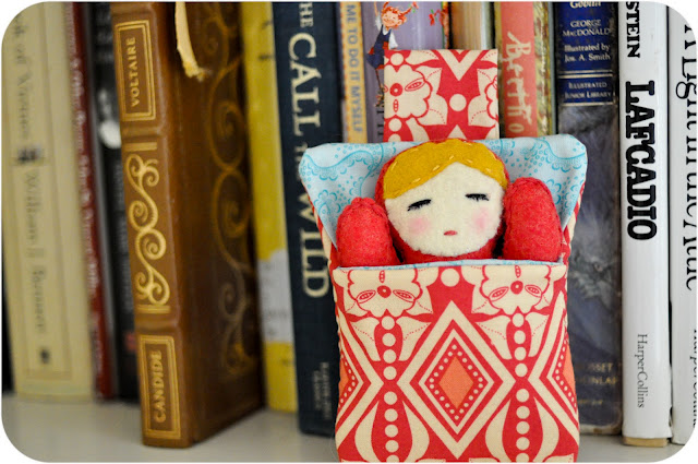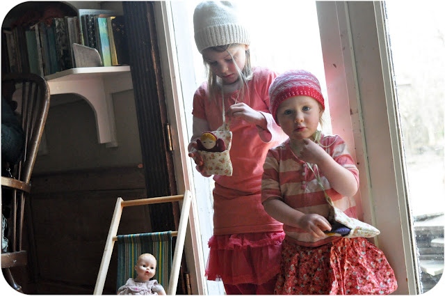 Then I thought to myself that these dollies really needed a little sleeping bag to be tucked into. And then I thought that the little sleeping bags needed to double as a way to carry the dollies. So I designed a little sleeping pouch with a tab across the top so that a ribbon can be strung through and then tied to make a little necklace.
