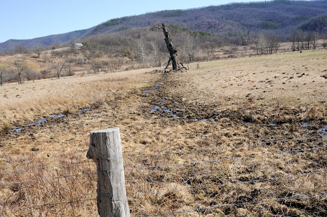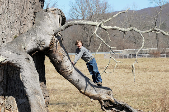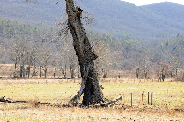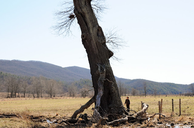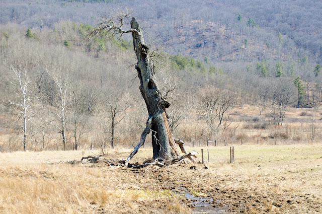 We did find the tree, but it and the pasture surrounding it were quite different in the stark winter landscape than in the summertime photo in our Remarkable Trees of Virginia book. Of course that photo was also taken a few years back, and since then the tree has lost it’s top; now more of a monument than the great tree it once was.