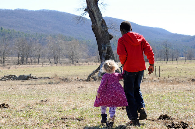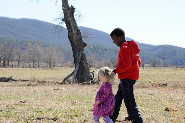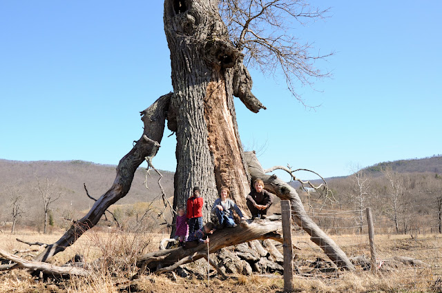 We got permission to climb the barbed wire fence (tricky tricky for this pregnant lady!) and headed across the pasture to visit the tree. The lone cow in the field watched us with interest. Gabriel and Beatrix had a great time talking about cow “poo” and doing their best to avoid the abundant patties.