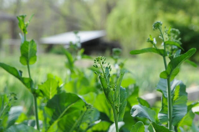 We’ve been eating lots of yummy collard greens, planted last fall. It is amazing how quickly they went from small plants to towering greens going to seed as soon as the weather warmed.