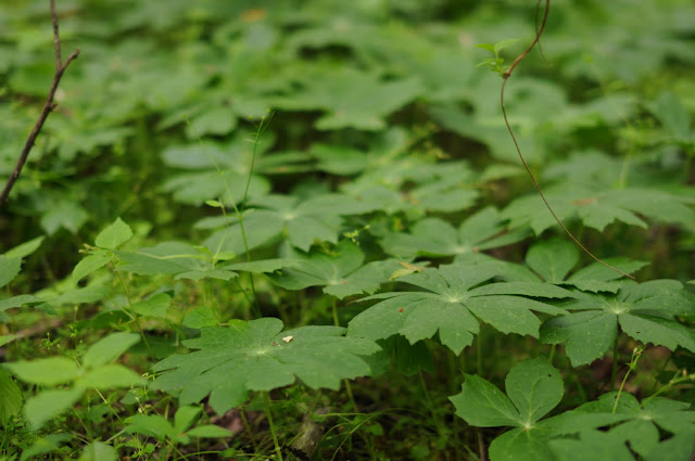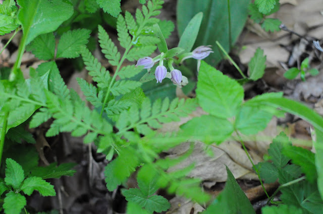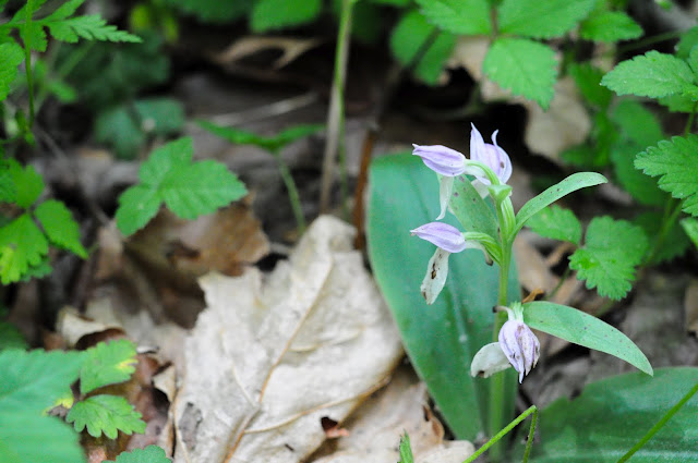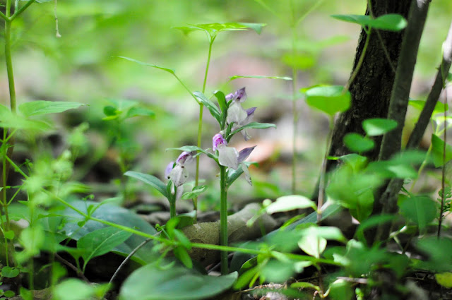 Barely perceptible beneath the green of the forest floor, tiny pale lavender blooms atop thick broad leaves that drew nearly as much attention as the flowers themselves.
