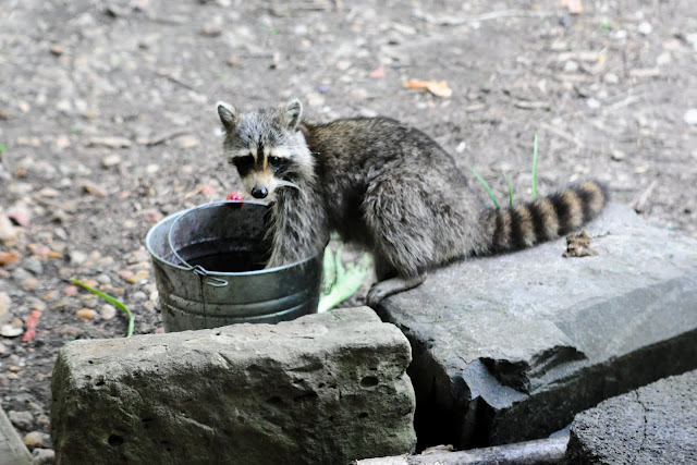 Mama raccoon had her babies and is coming mid day to raid the compost bucket. She only does this when she’s nursing. We assume it’s the same raccoon every year, but of course there may be a whole slew of different mamas coming to eat. (photo taken through the glass door)