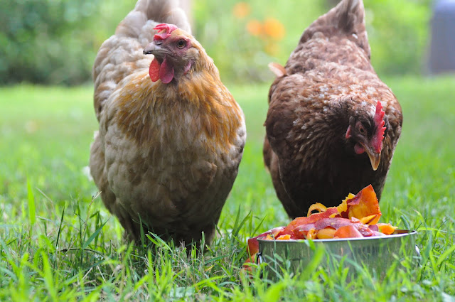 a couple of our girls, nibbling at the peach skins, ultimately turning their beaks up and walking away
