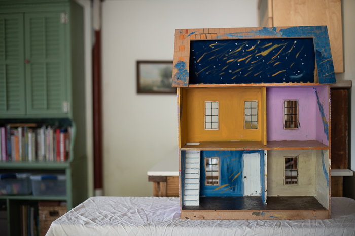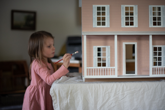 Just a quick explanation for the other photos in this post: Mabel insisted that we make pies from the one surviving tan cheese pumpkin that we grew last year and it felt good to use it rather than let it rot. She also got excited when we drove by a yard sale and spotted a purple dollhouse. I bought it for five dollars and we have started the process of redoing it. I’ve never done something like this before! I was super excited at first, but then got sick and I’m not sure when I’ll get my motivation back. But here you have the before photos and maybe someday there will be after. I have primed it inside and out and we got the first coat of paint on the siding. Mabel insisted on pink!
