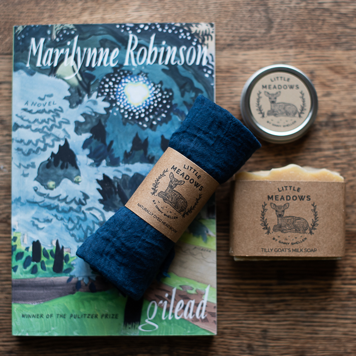 For this first giveaway, I’m including an indigo dyed kerchief sized organic cotton gauze scarf and a 1 oz tin of calendula salve in addition to a bar of beeswax and honey soap and a (gently used) copy of Gilead by Marilynne Robinson. (If you are interested in knowing why I’m giving away used vs. new books, see this post.) I first read Gilead years ago when a friend gave me a copy for my birthday. Maybe you’ve already read it, but you can always pass the book along to a friend!