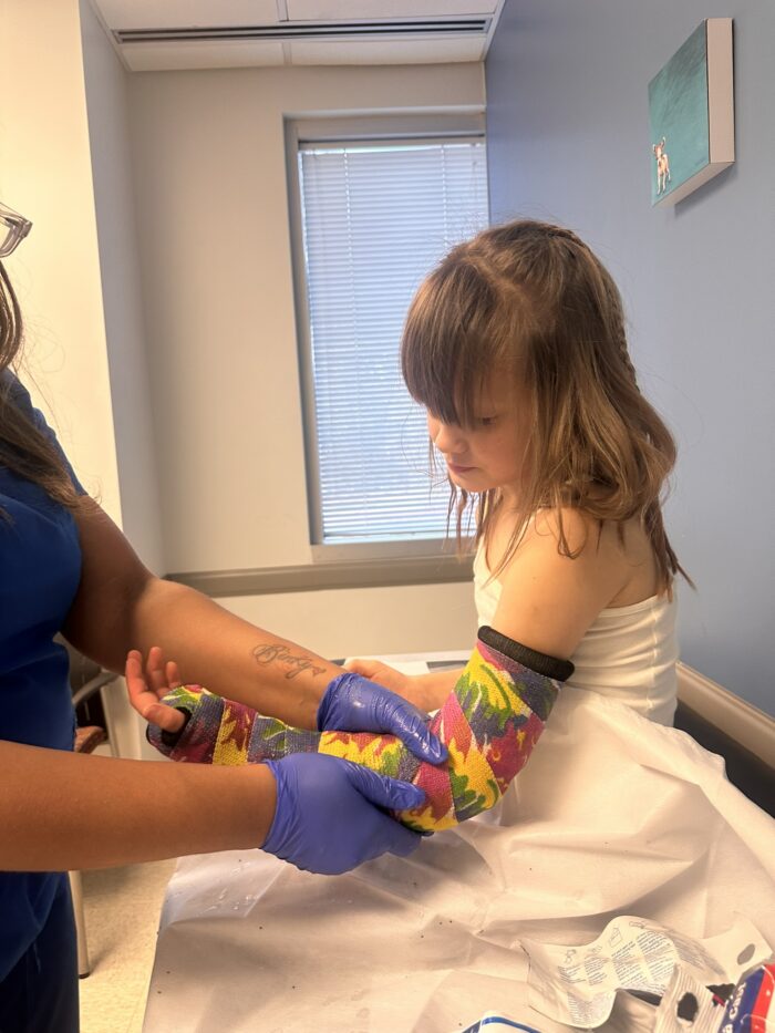 Jonny and Beatrix took Mabel to the urgent care clinic closest to our house only to be told they couldn’t x-ray her. Things were kind of crazy as I was texting with our pediatrician while looking up clinics online, with Jonny on the phone waiting to be told where to go next. He finally found a clinic that could x-ray Mabel’s arm and made it there less than ten minutes before closing time. X-rays showed an uncomplicated fracture to her humerus near the elbow. She was splinted and we were told to follow up with ortho the following week. Tuesday morning, Mabel and I arrived at her appointment expecting her to get a cast and be sent home. The physician’s assistant had some concerns after looking at her x-rays and sent them to a pediatric specialist who called him within minutes and said that she needed an operation and he wanted to do it the following day. I was not expecting that! I held my tears and we headed home to prepare to drive to Richmond (a little over an hour from home) to meet with the surgeon that afternoon. That appointment felt chaotic as Jonny and I both wanted to be there and we brought Ambrose along as well (hence, the chaos). Mabel was in good spirits, and I should add that she has been since getting her arm splinted that first night. She has always been a tough kid. After looking at Mabel’s x-rays again, the surgeon told us someone would be calling us the following day with an estimate and date for the surgery, with him operating before the end of the week.