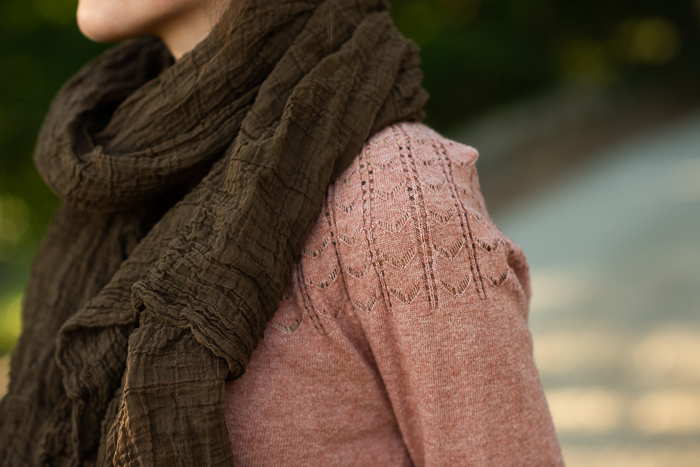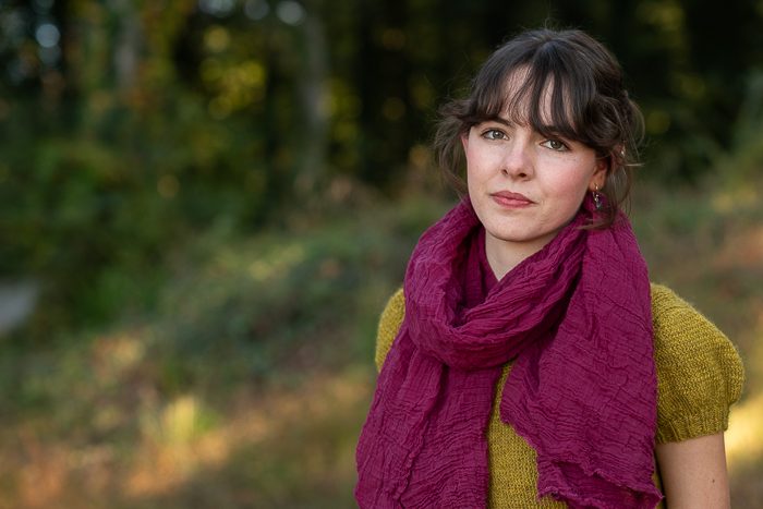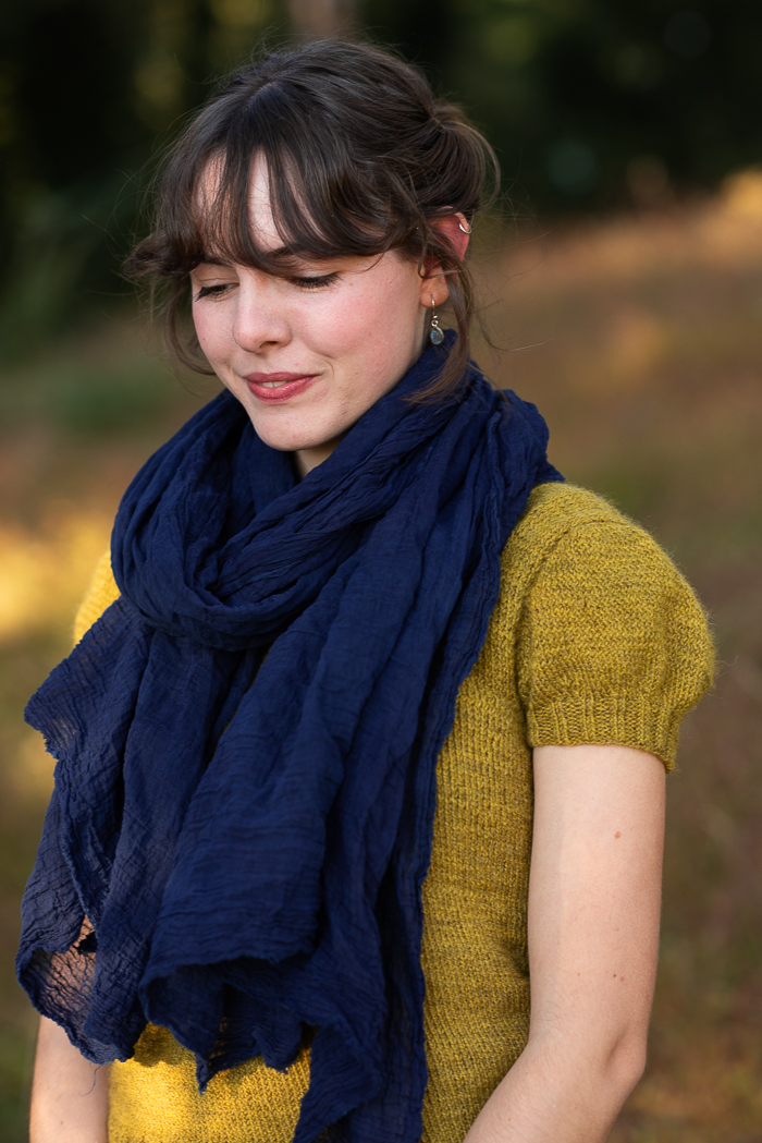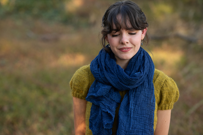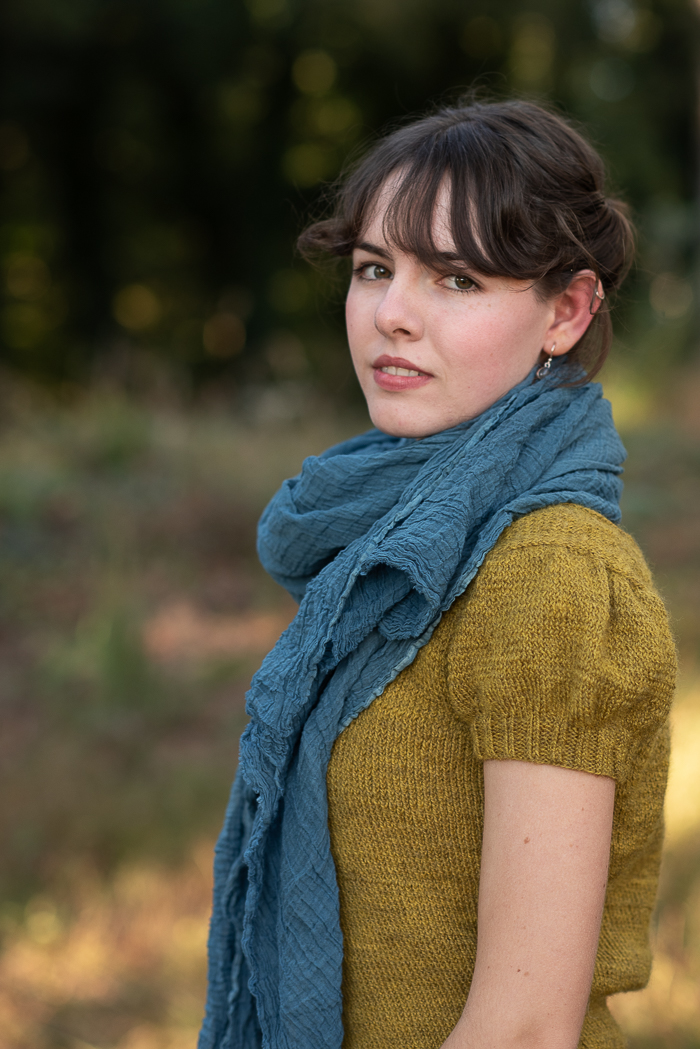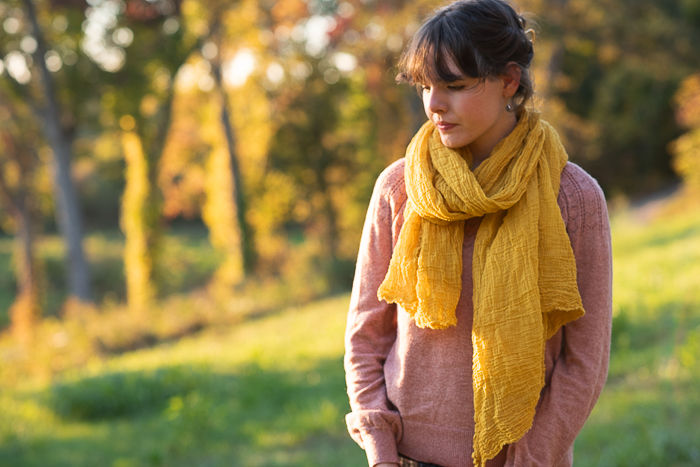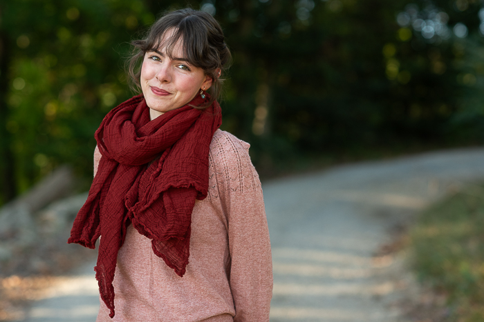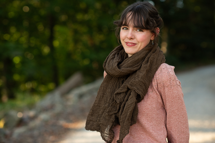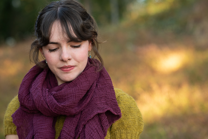 My beautiful model is Lark’s dear friend Josie, who happens to be the younger sister of my daughter-in-law, so she’s basically family. I was so pleased when she agreed to model my scarves for me! Also, I have to point out that she knit the green sweater she is wearing in some of the photos! She was working on it in the last photo below that I shared in a recent post.