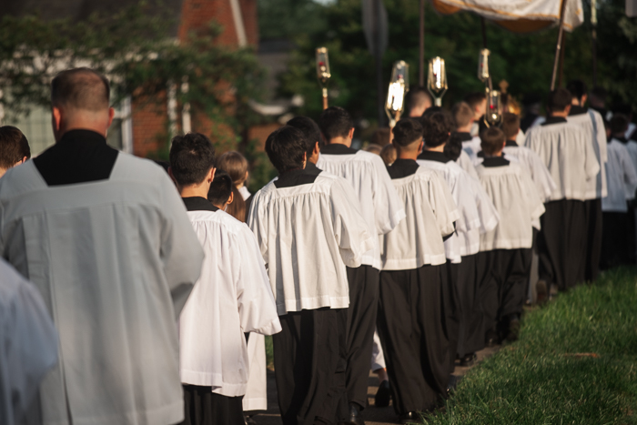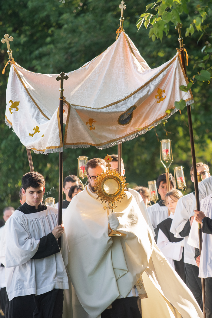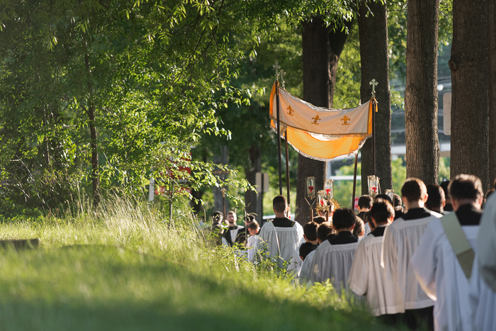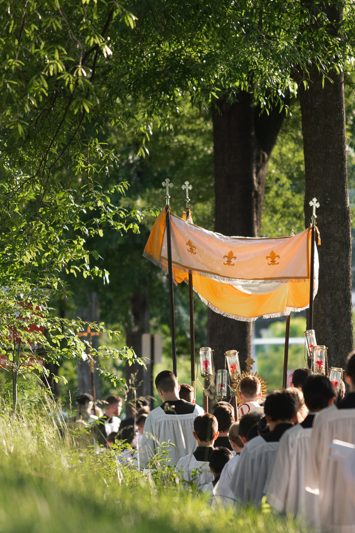 We have these processions in Poland. The 1st Communicants from the previous May always walk in procession first behind the Eucharist and behind them are the younger girls and boys in the parish who are awaiting their 1st communion. The girls dress in traditional costume and throw flower petals and the boys dress in small albs and ring bells. We walk from altar to altar (usually 4) and sing psalms and stop at each one and hear a short scripture and reflection. Each day after, for 8 days, there are small processions around the church with flower throwing and bell ringing. Sometimes my kids do all eight days, sometimes just a couple (we live down the block from our church so they take themselves). It is one of the biggest most long awaited for feasts for the younger children. I love that more and more parishes in the U.S. are bringing back processions. Its so wonderful to see people of all ages walking with Jesus from the church out into the public.